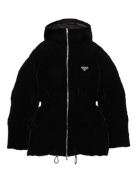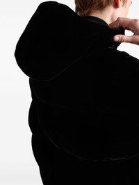 velvet puffer jacket Highlights - Black - Hooded design - Zip fastening - Elasticated waist - Gathered sleeves - Logo emblem Composition Outer: Viscose 65%, Cupro 35% Lining: Goose Down 100% Washing instructions Read Manufacturer Guidelines