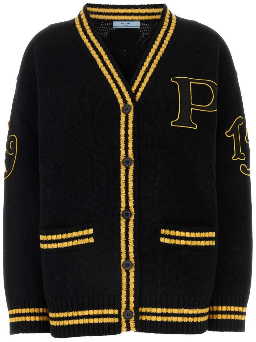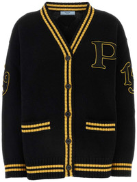 logo-appliqued cardigan Highlights - Black - Virgin wool-cashmere blend - Knitted construction - Front button fastening - V-neck - Drop shoulder - Long sleeves - Applique logo - Applique detailing - Two front welt pockets - Ribbed stripe trim - Straight hem Composition Polyester 100%, Virgin Wool 70%, Cashmere 30%