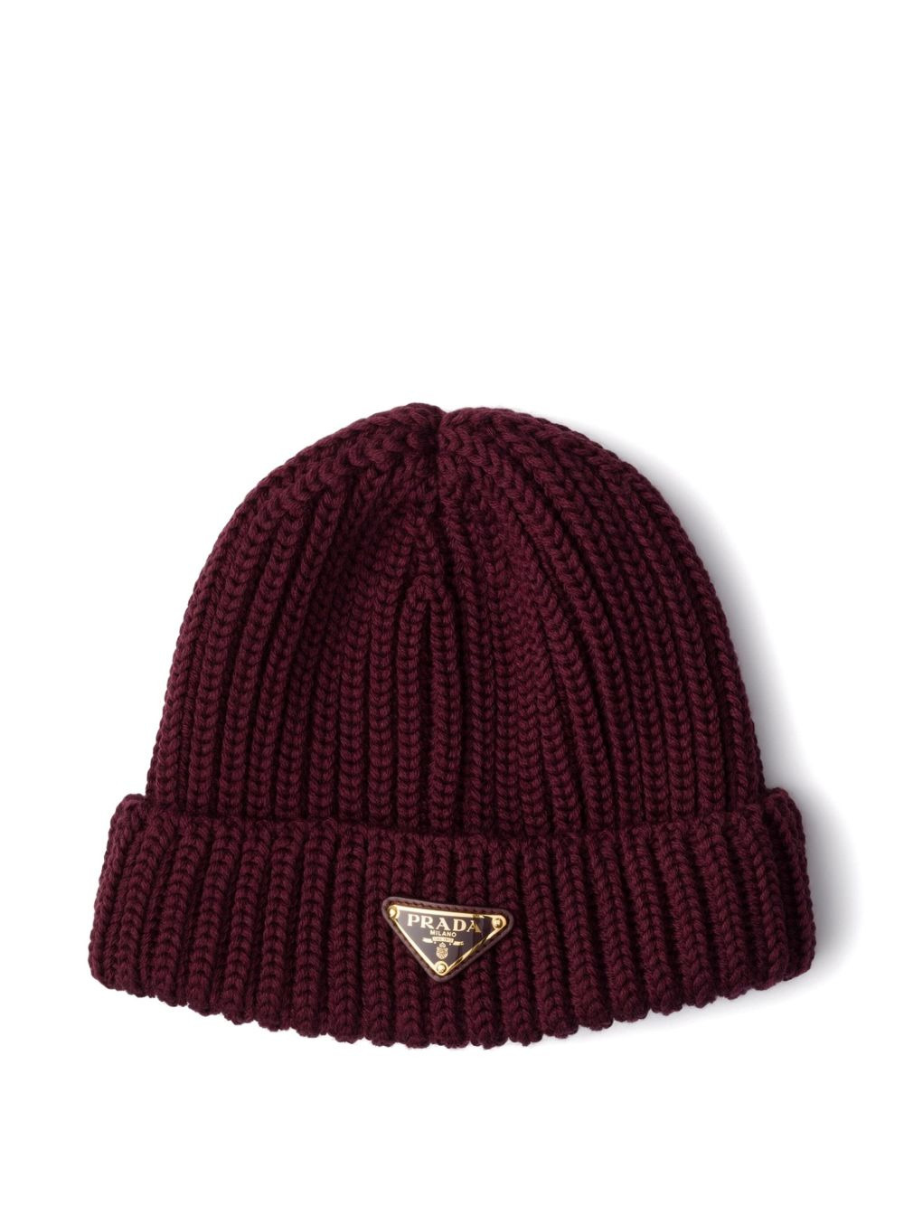 wool beanie Highlights - Burgundy - Wool - Ribbed knit - Enamel triangle logo - Folded brim Composition Virgin Wool 100%