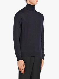 roll-neck wool jumper Highlights - Prada’s collections are defined by the finest quality fabrics and wonderfully unconventional designs pushing sartorial boundaries season after season. this navy blue wool turtleneck sweater from prada features long sleeves and a straight hem. Composition Virgin Wool 100%