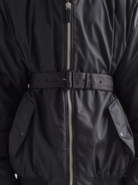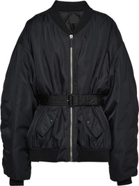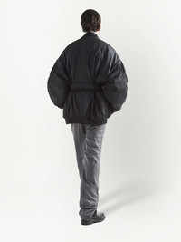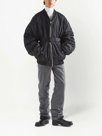 zip-fastening bomber jacket Prada's minimalist approach to design is showcased on this bomber jacket from the AW22 collection, which features a classic silhouette and the signature use of a monochromatic palette. Highlights - Black - Recycled nylon - Band collar - Long sleeves - Front zip fastening - Belted waist Composition Recycled Nylon 100%