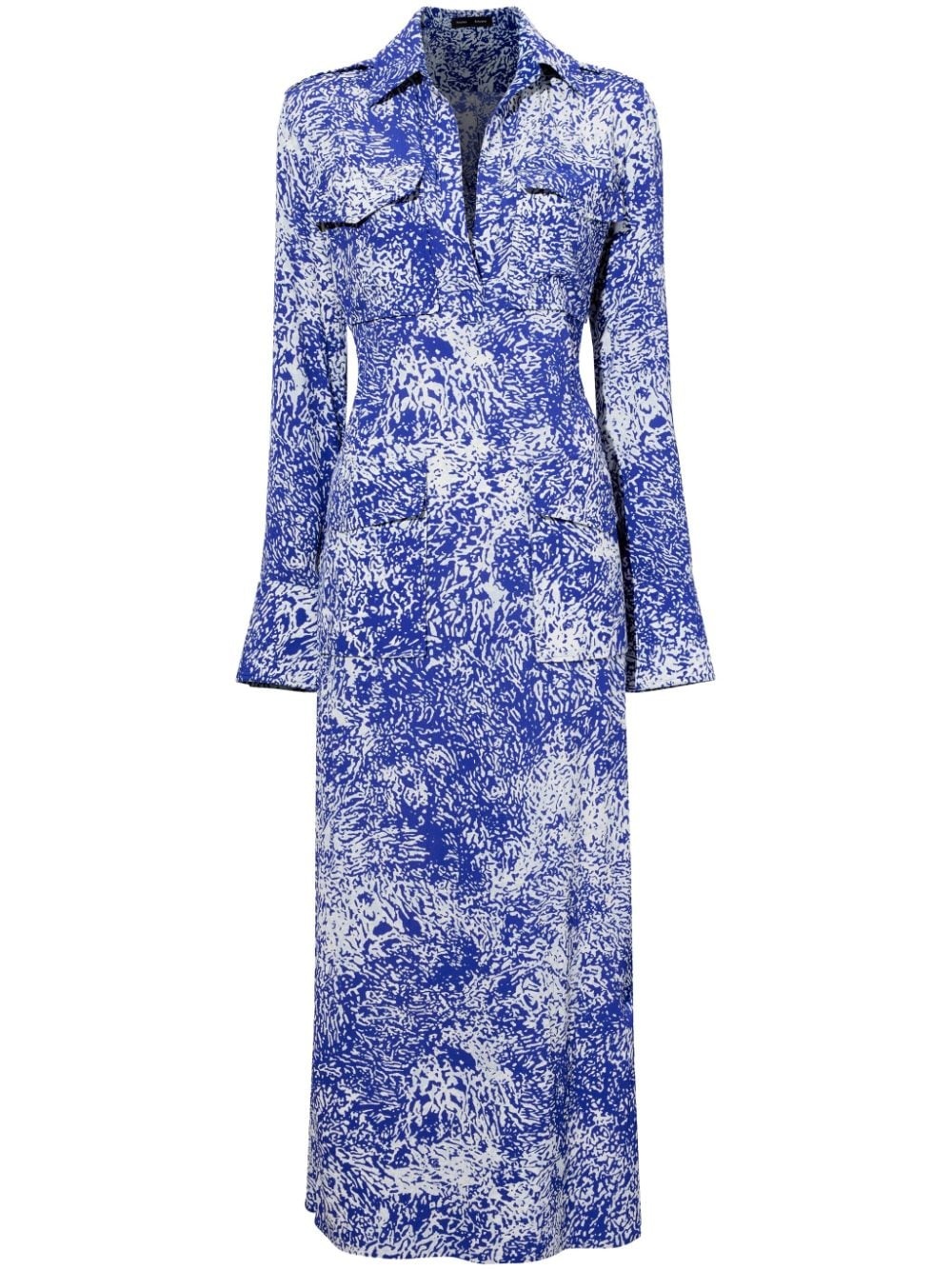 abstract-print crepe maxi dress Highlights - Blue/white - Crepe texture - Classic collar - V-neck - Detachable waist belt - Belt loops - Four front flap pockets - Long sleeves - Ankle-length - Straight hem Made in United States Composition Acetate 72%, Polyester 28%