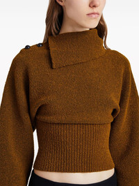 asymmetric-neck boucle jumper Defined by its asymmetric roll neck, this Proenza Schouler jumper is crafted with wool yarns for a textural boucle effect. Buttons on the shoulders add both style and practicality, while wide ribbed trims complete the look. Highlights - Walnut brown - Wool blend - Boucle design - Asymmetric neck - Button fastening at the shoulder - Long sleeves - Ribbed trim - Straight hem - Cropped Made in Italy Composition Wool 65%, Polyamide 34%, Elastane 1% Washing instructions Dry Clean Only