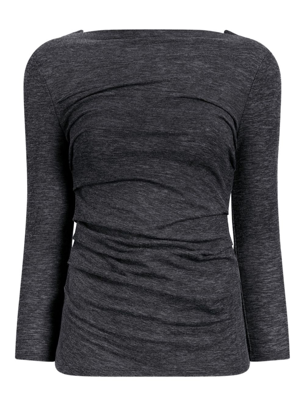 Blythe boat-neck gathered top Highlights - Grey - Boat neckline - Gathered detailing - Three-quarter sleeves Imported Composition Polyester 46%, Rayon 34%, Wool 20% Washing instructions Read Manufacturer Guidelines