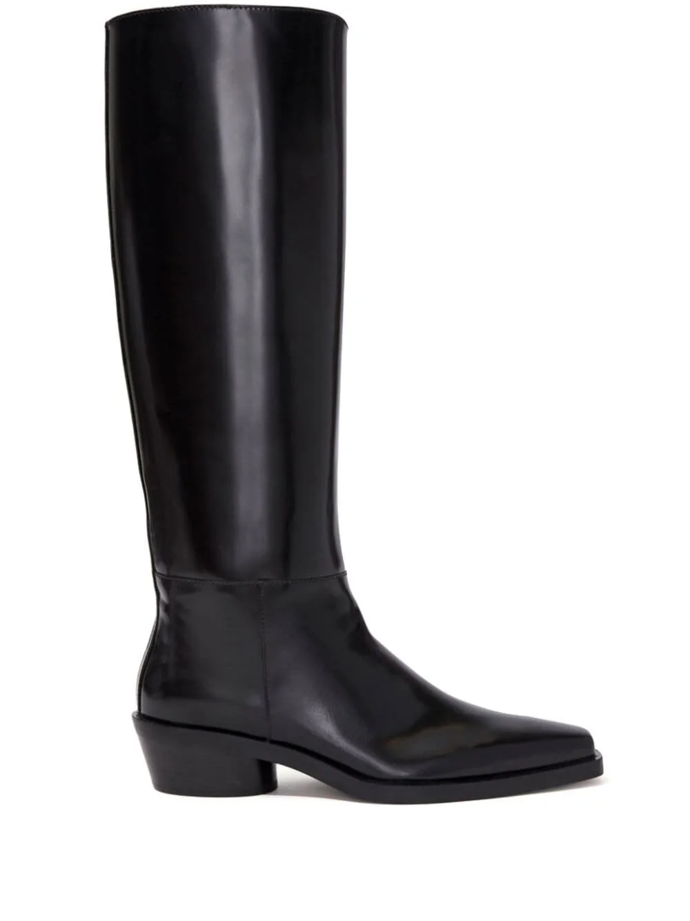 Bronco knee-high boots Highlights - Black - Calf leather - Brushed finish - Pull-on style - Stacked heel - Pointed toe - Rubber outsole - Knee-high Made in Italy Composition Sole: Rubber 100%, Calf Leather 100% Outer: CALFSKIN 100%
