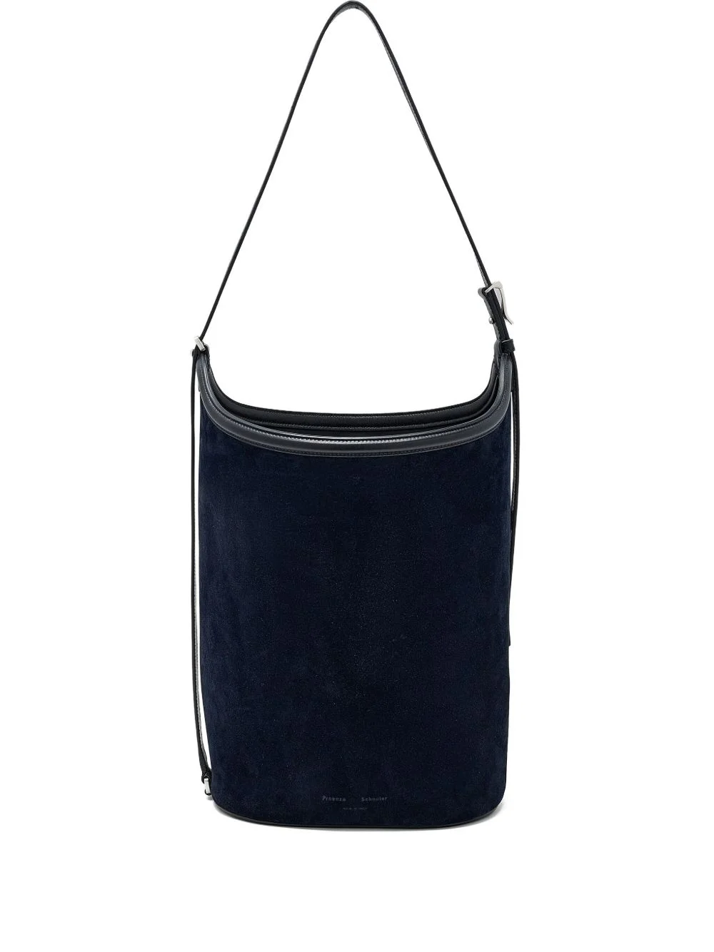 bucket-shape suede-leather tote bag Highlights - Dark blue - Suede texture - Leather trim - Top handle - Buckle fastening - Drawstring closure Made in Italy Composition Outer: Leather 100%, Calf Suede 100% SIZE & FIT Measurement DEPTH 6.69 in(17 cm) HANDLE 14.56 in(37 cm) HEIGHT 14.56 in(37 cm) WIDTH 9.44 in(24 cm)