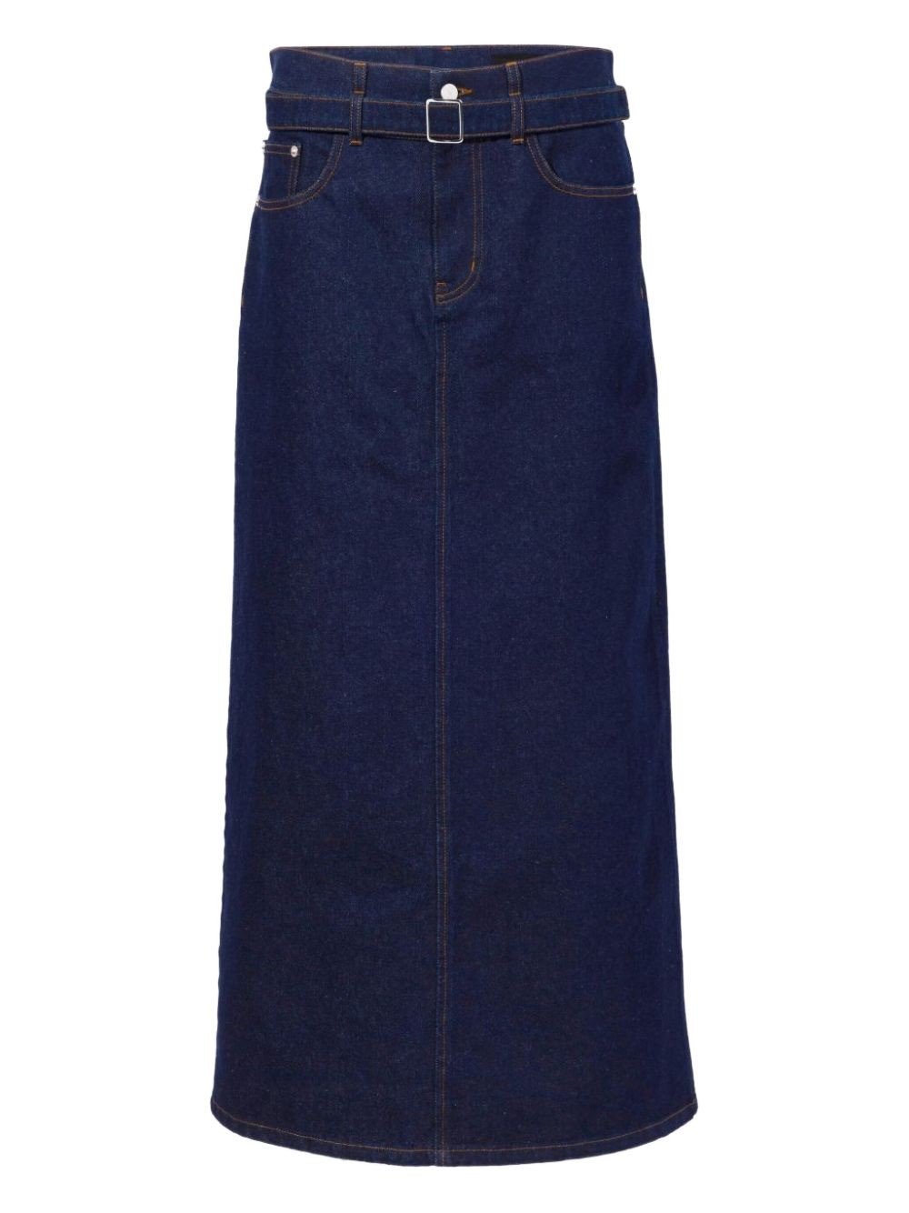 Calder denim skirt Highlights - Indigo blue - Stretch-cotton - Denim - Concealed fly and button fastening - Contrast stitching - Detachable and adjustable waist belt - Classic five pockets - Straight hem - Ankle-length Imported Composition Cotton 98%, Elastane 2% Washing instructions Machine Wash