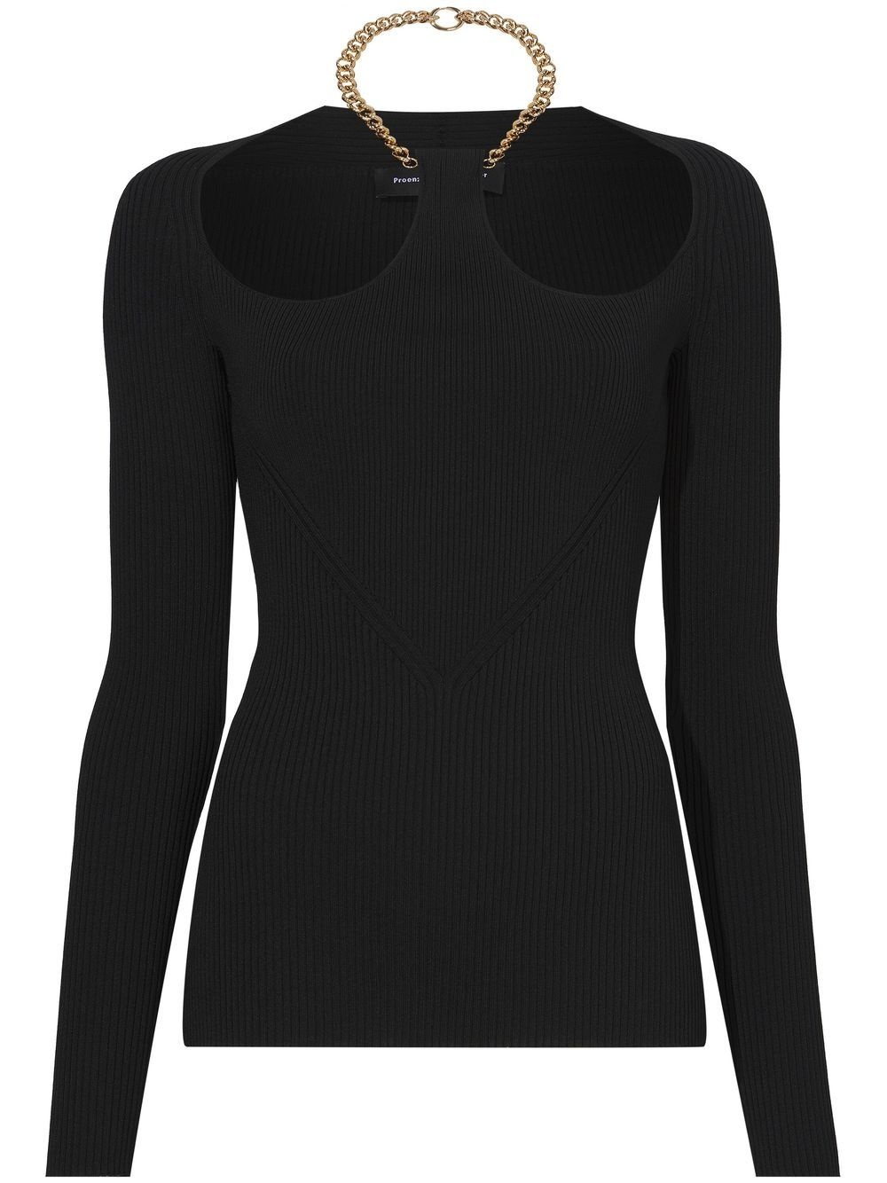 chain-detail ribbed-knit jumper Highlights - Black - Ribbed knit - Gold-tone hardware - Chain-link neck strap - Cut-out detailing - Long sleeves - Straight hem Imported Composition Viscose 77%, Polyamide 23%