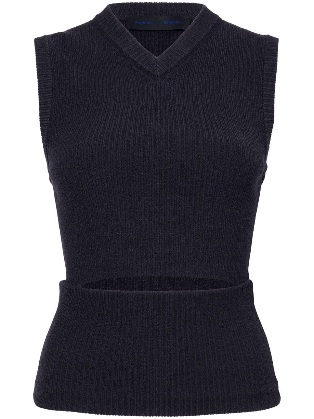 Cruz top Highlights - Charcoal grey - Ribbed knit - V-neck - Sleeveless - Cut-out detailing - Decorative button detailing - Straight hem Imported Composition Viscose 55%, Wool 37%, Polyester 8%