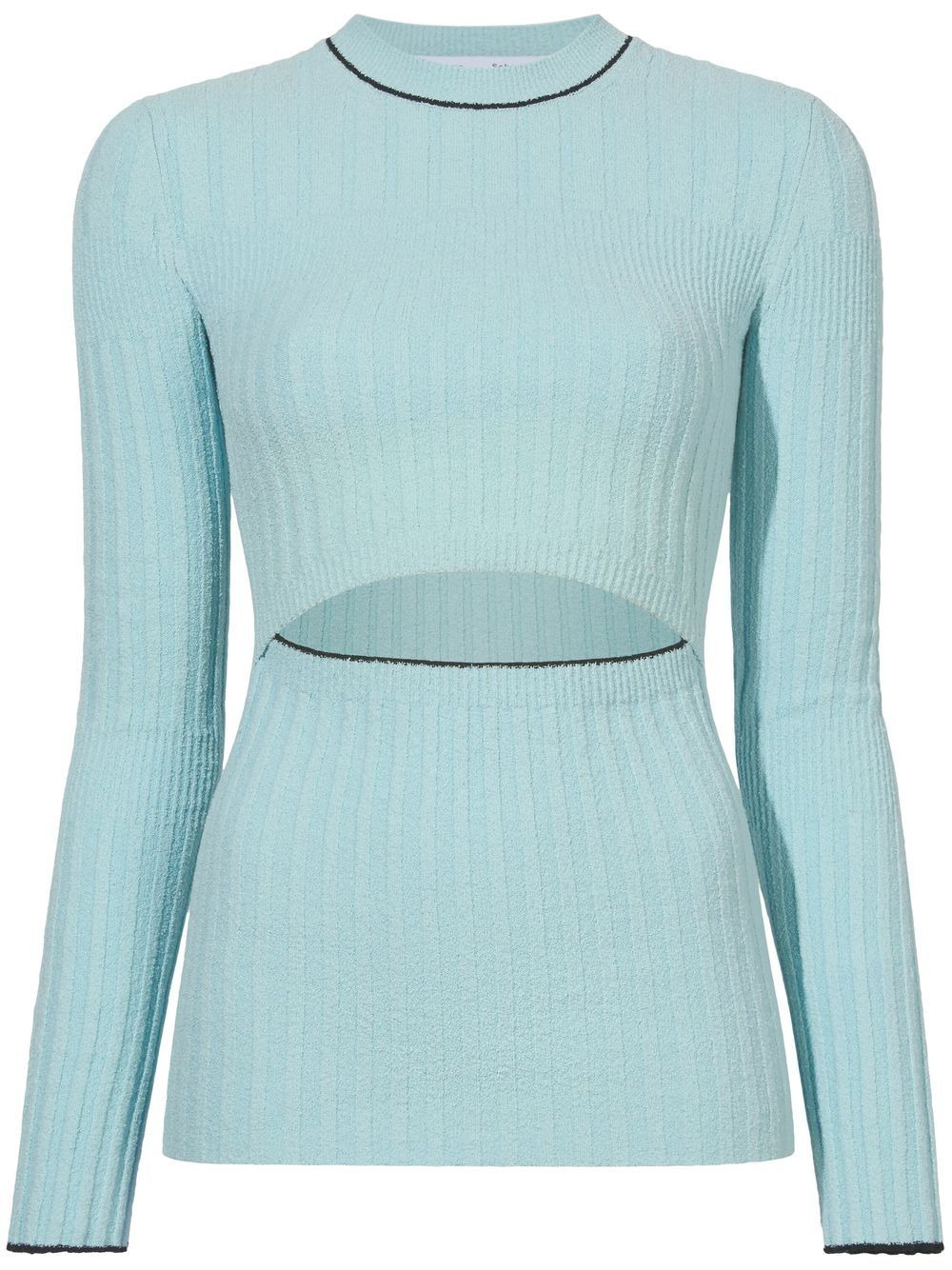 cut-out boucle knitted top Proenza Schouler reinterprets classic knitwear with this fine-knit top. Designed with a boucle effect, this light blue iteration is punctuated with a cut-out waist panel and contrasting piped trims. Imported Composition Cotton 67%, Nylon 22%, Spandex/Elastane 11%