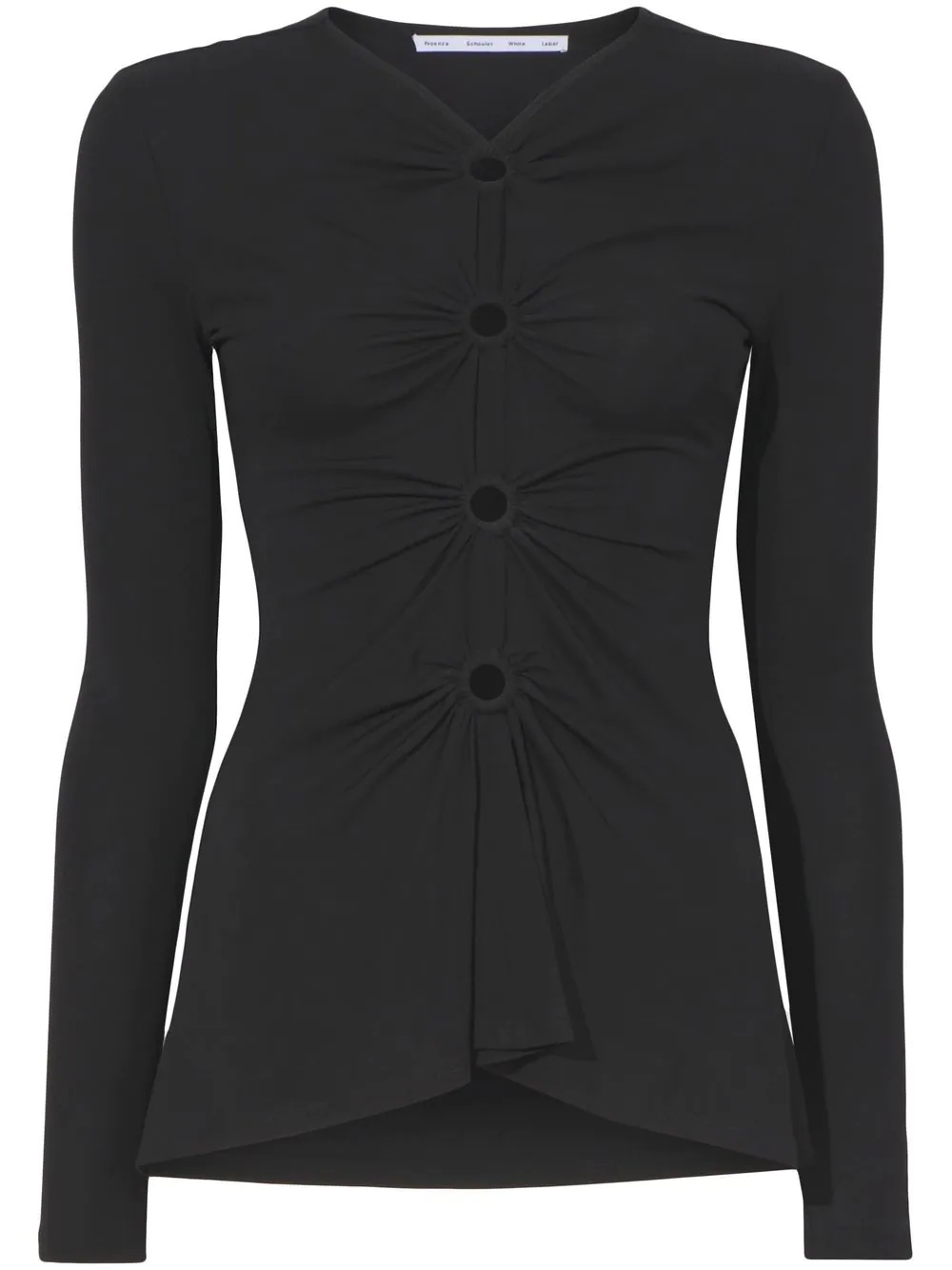 cut-out detailed long-sleeved top With a focus on contemporary cut-out detailing, Proenza Schouler White Label presents this long-sleeved top in a sleek black tone, with the cut-out ring elements running through the centre of the design. Imported Composition Viscose 100%