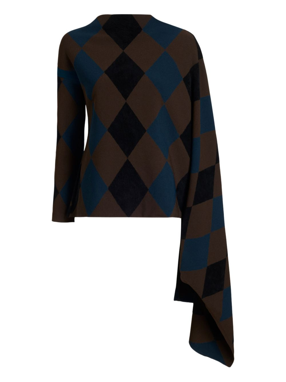 diamond-pattern draped top Highlights - Dark-brown - Diamond pattern - Asymmetric draped design - Long sleeves Made in Italy Composition Viscose 100%, Polyester 100% Washing instructions Read Manufacturer Guidelines