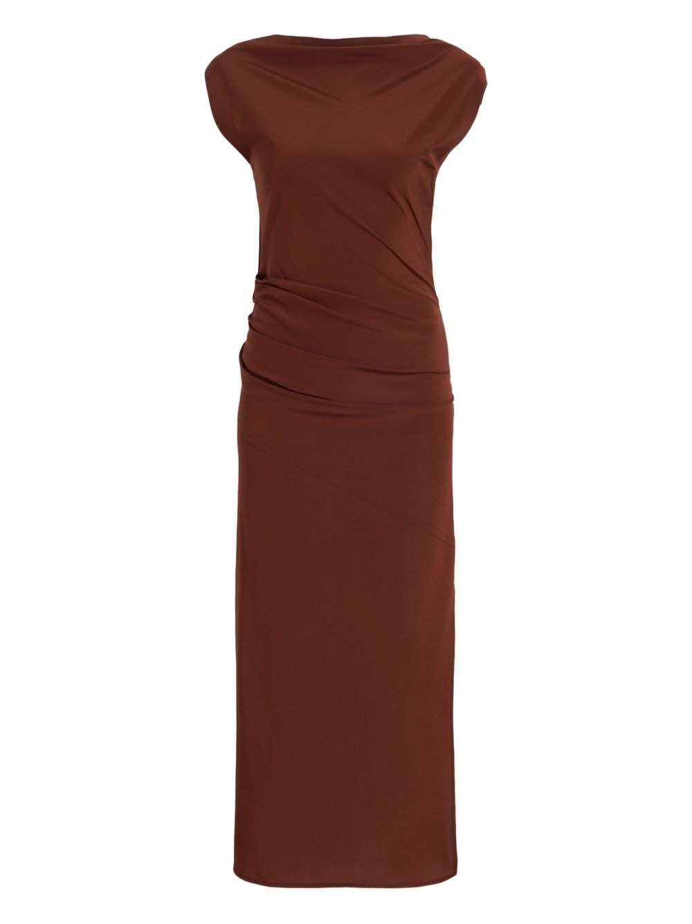 draped cowl-neck midi day dress Highlights - Brown - Cowl neck - Draped bodice - Asymmetrical neckline - Gathered waist - Midi length Imported Composition Triacetate 70%, Polyester 30% Washing instructions Read Manufacturer Guidelines
