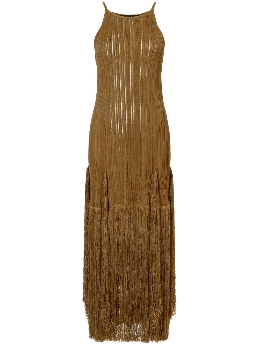 Everly dress Highlights - Chestnut brown - Semi-sheer construction - Ribbed detailing - Halterneck - Sleeveless - Fringed edge - Ankle-length Imported Composition Viscose 83%, Cotton 9%, Polyamide 8%