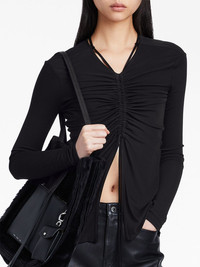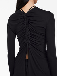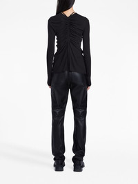 gathered-detail long-sleeve top Highlights - Black - Crepe texture - Stretch-design - V-neck - Gathered neckline - Gathered detailing - Long sleeves - Front slit - Straight hem Imported Composition Viscose 100% Washing instructions Dry Clean Only
