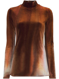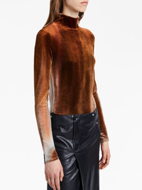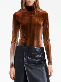 Ice Dyed velvet top Proenza Schouler demonstrates elevated craftsmanship with this velvet top, made using an artisanal ice-dye technique. Strokes of colours embellish the silhouette, which features a mock neck and a slim fit. Highlights - Barley brown - Velvet - All-over graphic print - Mock neck - Long sleeves - Straight hem Made in United States Composition Cotton 46%, Modal 30%, Nylon 22%, Elastane 2% Washing instructions Dry Clean Only