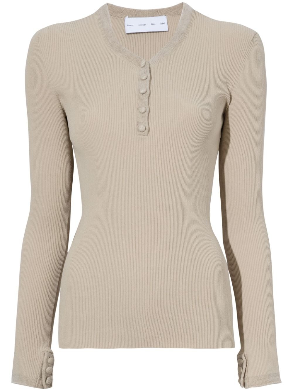 Isla knitted top Highlights - Khaki beige - Wool - Viscose rib - Front button placket - V-neck - Long sleeves - Buttoned cuffs - Straight hem Imported Composition Wool 100%, Viscose 82%, Polyester 18%