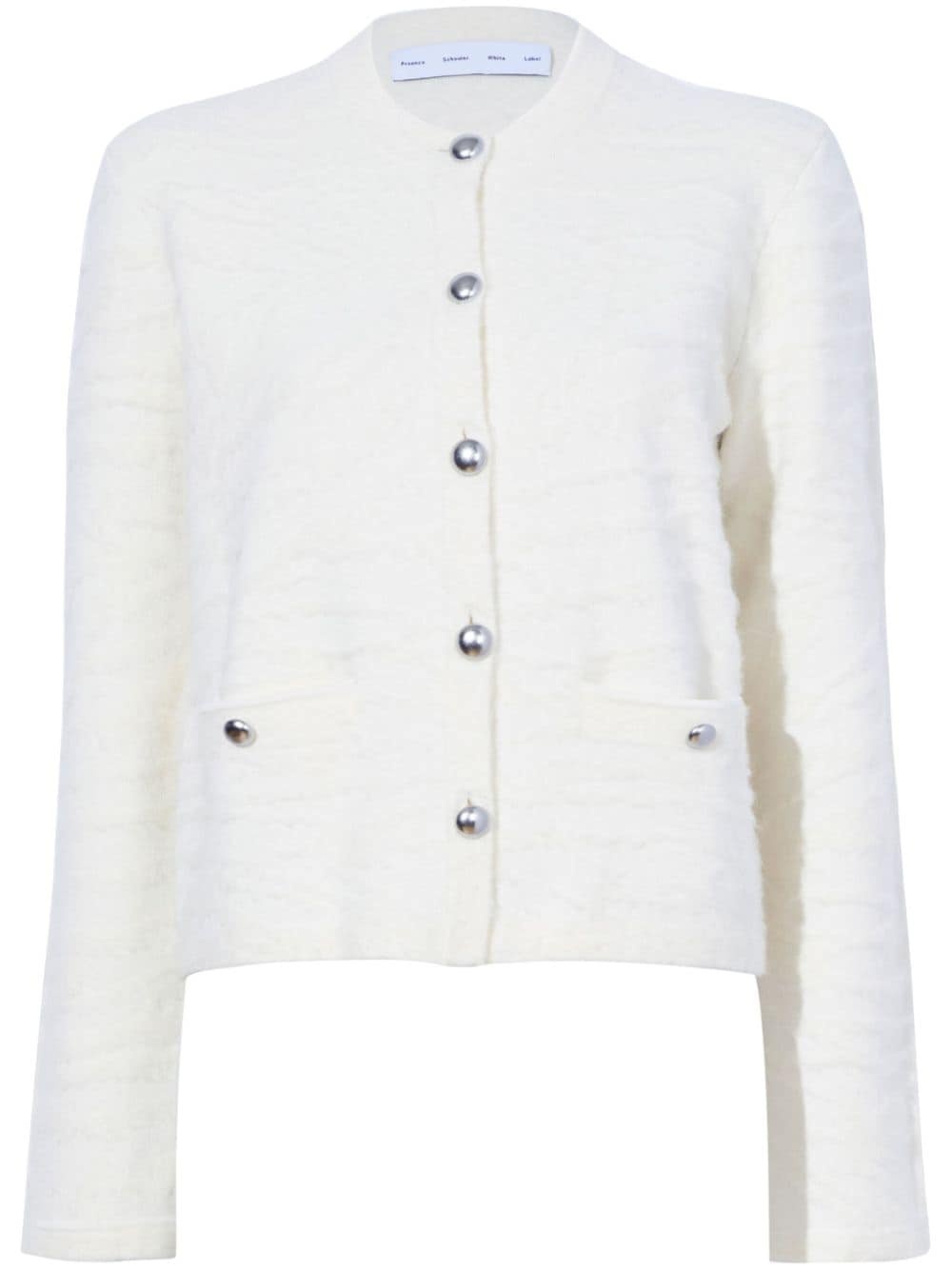 Josephine jacket Highlights - White - Knitted construction - Brushed finish - Front button fastening - Ribbed band collar - Crew neck - Long sleeves - Two front welt pockets - Straight hem Imported Composition Wool 100%, Cotton 100%, Polyamide 100%, Alpaca 100%, Polyester 100%, Elastane 100% Washing instructions Dry Clean Only