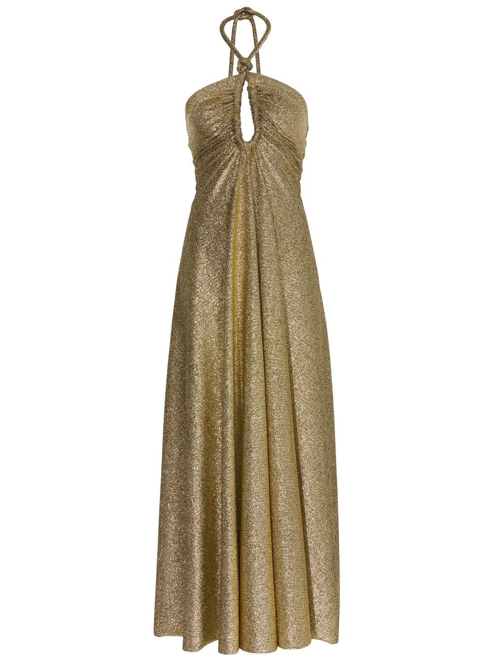 metallic-effect jersey halterneck dress Highlights - Gold-tone - Metallic effect - Cut-out detailing - Halterneck - Sleeveless - Flared - Mid-length - Straight hem Imported Composition Viscose 73%, Polyester 20%, Spandex/Elastane 7% SIZE & FIT Measurement HIPS 34.64 in(88 cm) LENGTH 54.33 in(138 cm) WAIST 23.62 in(60 cm) Washing instructions Dry Clean Only