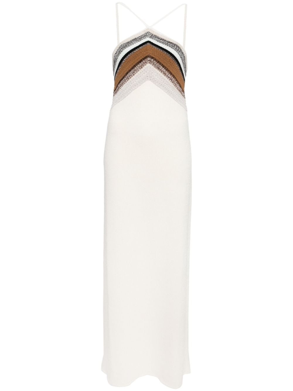 Naomi halterneck knitted maxi dress Highlights - White/multicolour - Knitted construction - Chevron knit detailing - Halterneck - Spaghetti straps - Straight-cut - Straight hem - Long length Made in Italy Composition Wool 49%, Viscose 42%, Polyamide 4%, Polyester 4%, Acetate 1% SIZE & FIT Model measurements Height 5 ft 10 in(1.78 m) Bust/Chest 33.46 in(85 cm) Hips 36.22 in(92 cm) Waist 23.22 in(59 cm) FittingInformation Designed for a close fit at the chest with a loose fit over the waist and hips Made from a midweight non-stretch fabric This piece fits true to size – take your usual size
