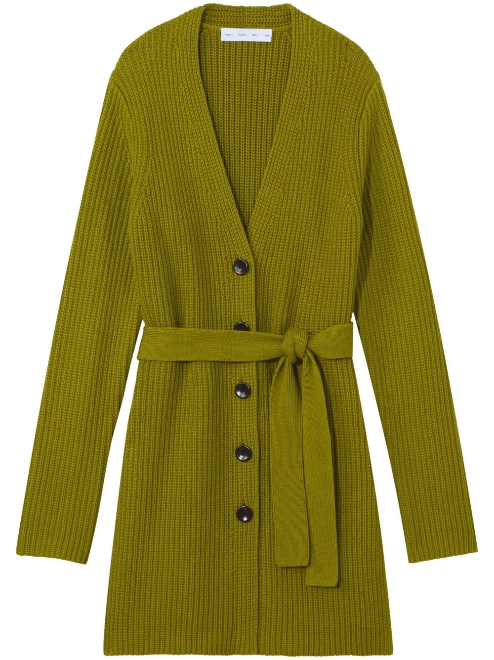 ribbed-knit belted cardigan This Proenza Schouler White Label longline cardigan comes complete with an attached self tie belt that adjusts its silhouette. The knitted piece is spun with a hint of cashmere for a softer touch. Highlights - Moss green - Cotton-cashmere blend - Ribbed knit - V-neck - Front button fastening - Belted waist - Long sleeves - Straight hem Imported Composition Cotton 95%, Cashmere 5%