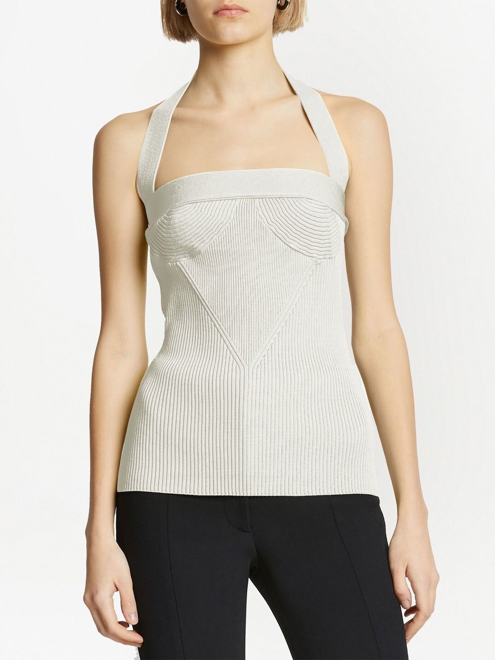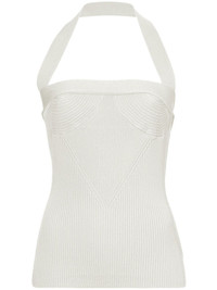 ribbed-knit halterneck knitted top Highlights - Off-white - Ribbed knit - Bustier-style neckline - Halterneck - Sleeveless - Straight hem Imported Composition Viscose 79%, Polyamide 15%, Polyester 6%