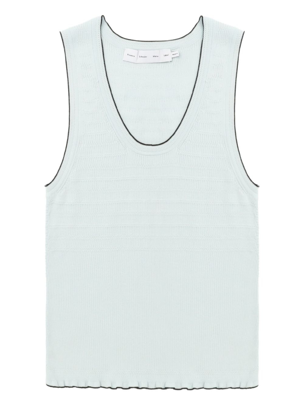 ribbed-knit scalloped-hem top Highlights - Light blue - Ribbed knit - Sleeveless - Round neck - Scalloped hem - Black trim Imported Composition Cotton 100% Washing instructions Read Manufacturer Guidelines
