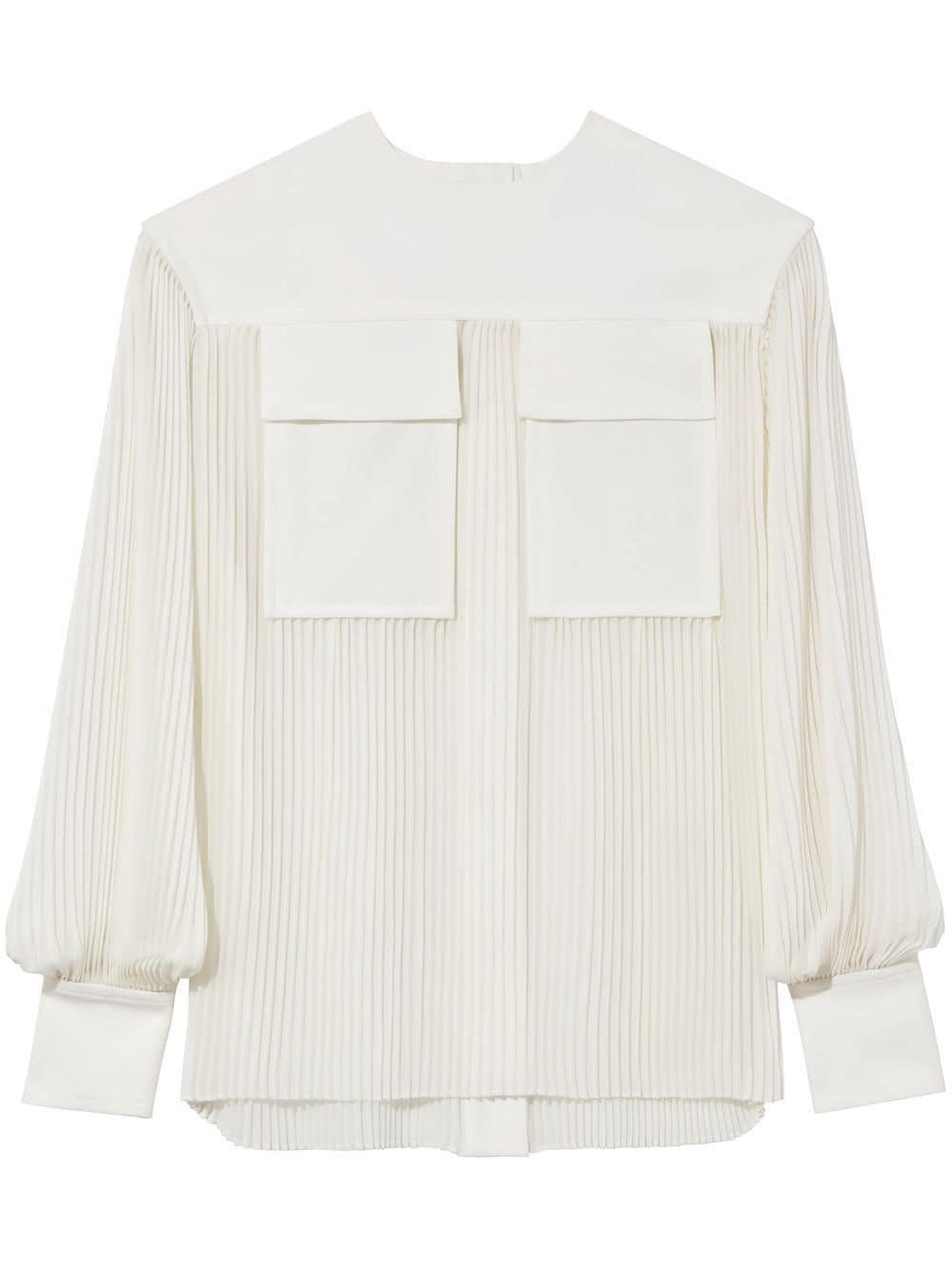 sheer pleated blouse white fully pleated round neck concealed front button fastening long sleeves buttoned cuffs straight hem two front flap pockets Imported Composition Outer: Polyester 100% Lining: Polyester 93%, Spandex/Elastane 7%