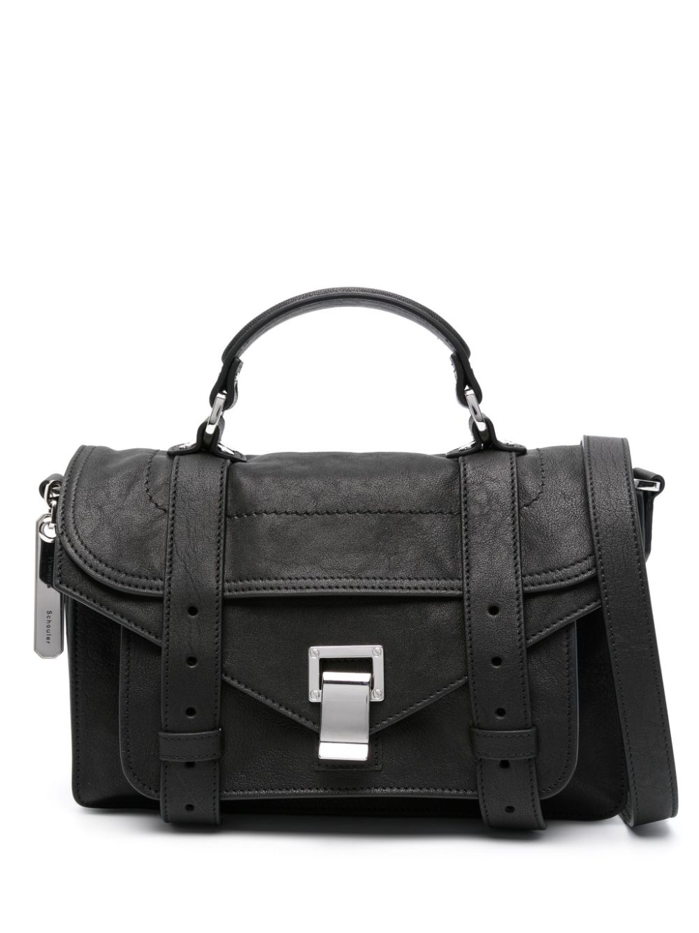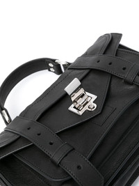 small PS1 leather bag Highlights - Black - Calf leather - Grained texture - Silver-tone logo plaque - Debossed internal logo - Silver-tone hardware - Foldover top - Twist-lock fastening - Two buckle-strap fastenings - Single flat top handle - Adjustable detachable shoulder strap - Slip pocket to the rear - Front patch pocket - Main compartment - Internal zip-fastening pocket - Logo-jacquard lining Made in Italy Composition Outer: Calf Leather 100% SIZE & FIT Model measurements Height 5 ft 9 in(1.76 m) Bust/Chest 31.88 in(81 cm) Hips 35.43 in(90 cm) Waist 22.44 in(57 cm) Measurement DEPTH 3.14 in(8 cm) HANDLE 2.36 in(6 cm) HEIGHT 6.69 in(17 cm) STRAP 19.68 in(50 cm)