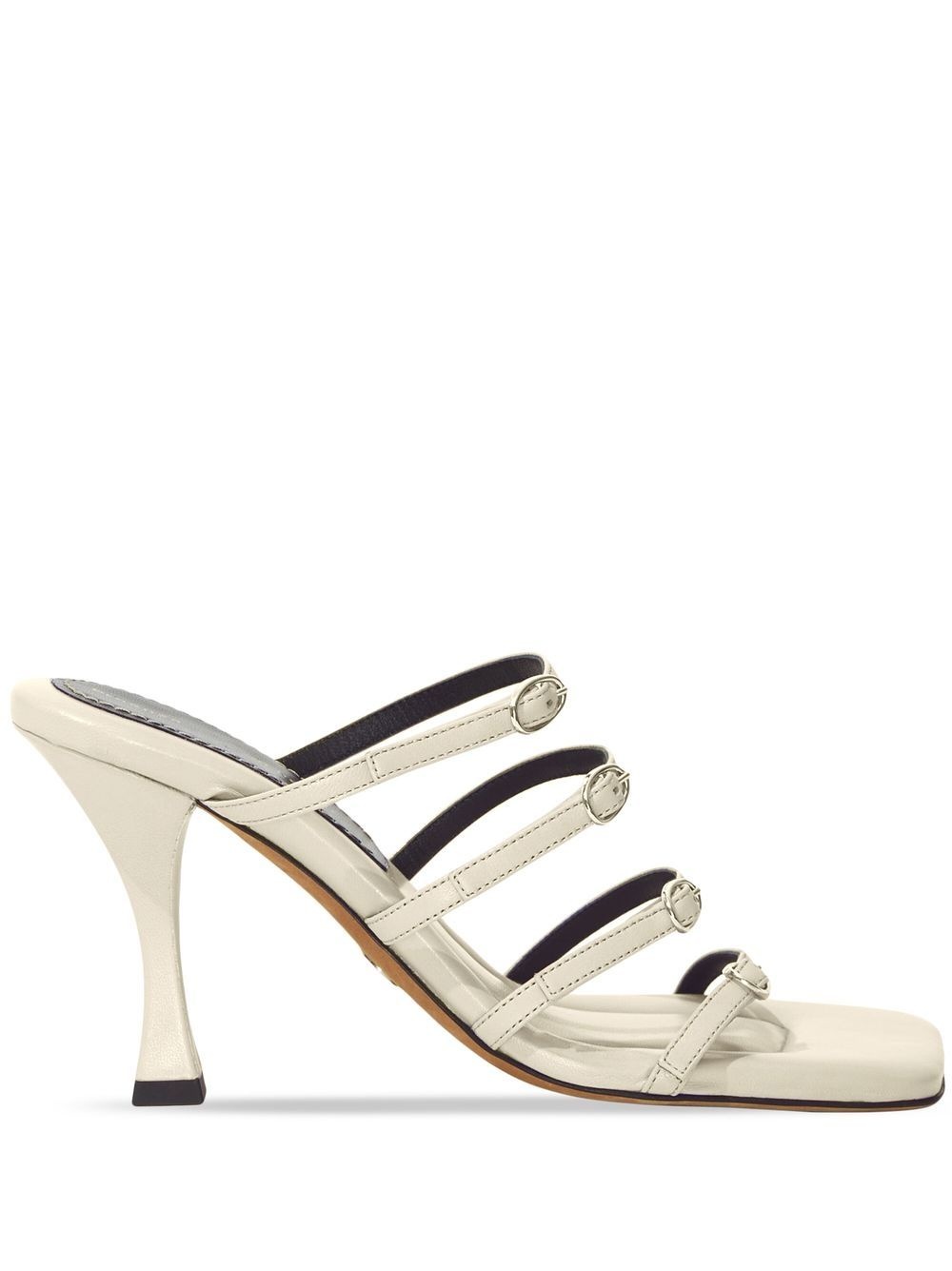 Square strappy 90mm sandals off-white leather decorative buckle detail square toe strappy design branded insole 90mm heel Made in Italy Composition Sole: Calf Leather 100% Outer: Lambskin 100% Lining: Lambskin 100% SIZE & FIT Measurement HEEL 3.54 in(9 cm)