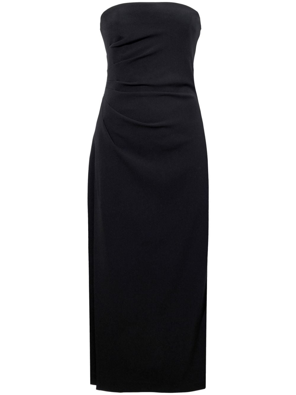strapless crepe midi dress Highlights - Black - Crepe texture - Strapless - Ruched detailing - Concealed side zip fastening - Side slit - Mid-calf length - Straight hem Imported Composition Triacetate 70%, Polyester 30% SIZE & FIT Measurement HIPS 38.58 in(98 cm) LENGTH 44.09 in(112 cm) WAIST 27.55 in(70 cm)