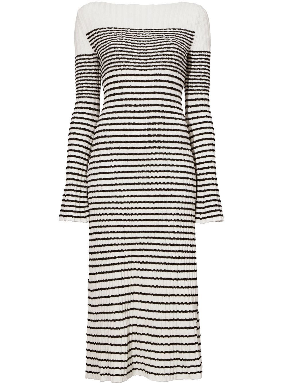 striped boucle knit dress off-white/black silk blend knitted construction horizontal stripe pattern boat neck long sleeves straight hem Imported Composition Outer: Viscose 83%, Polyester 17% Lining: Silk 82%, Nylon 18%