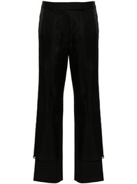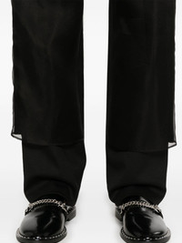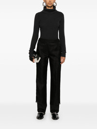 Teddy trousers Highlights - Black - Virgin wool blend - Interlock twill weave - Organza panels - Concealed front button, hook and zip fastening - Low-rise - Satin trim - Slip pockets to the sides - Dart detailing - Two rear button-fastening jetted pockets - Unlined - Straight leg Imported Composition Lining: Cotton 100% Outer: Polyester 100%, Silk 100%, Virgin Wool 98%, Elastane 2% SIZE & FIT Model measurements Height 5 ft 10 in(1.77 m) Bust/Chest 31.88 in(81 cm) Hips 36.22 in(92 cm) Waist 24.01 in(61 cm) FittingInformation Designed for a tapered fit, these trousers allow for a close fit at the waist and a loose unrestricted fit over the leg with a closer fit towards the ankle The adjustable tabs allow for fitted preferences Made from a midweight fabric