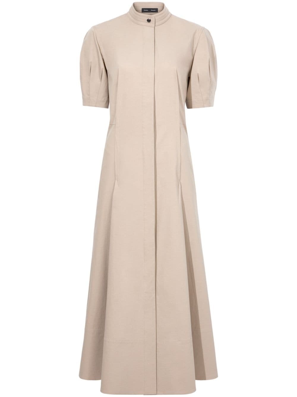 Tracey buttoned-slits midi dress Highlights - Khaki brown - Stretch-cotton - Gabardine weave - Pleat detailing - Band collar - Concealed front button fastening - Short sleeves - Turn-up cuffs - Fitted waistline - A-line skirt - Two thigh-high side buttoned-fastening slits - Mid-length Imported Composition Cotton 96%, Elastane 4% Washing instructions Dry Clean Only