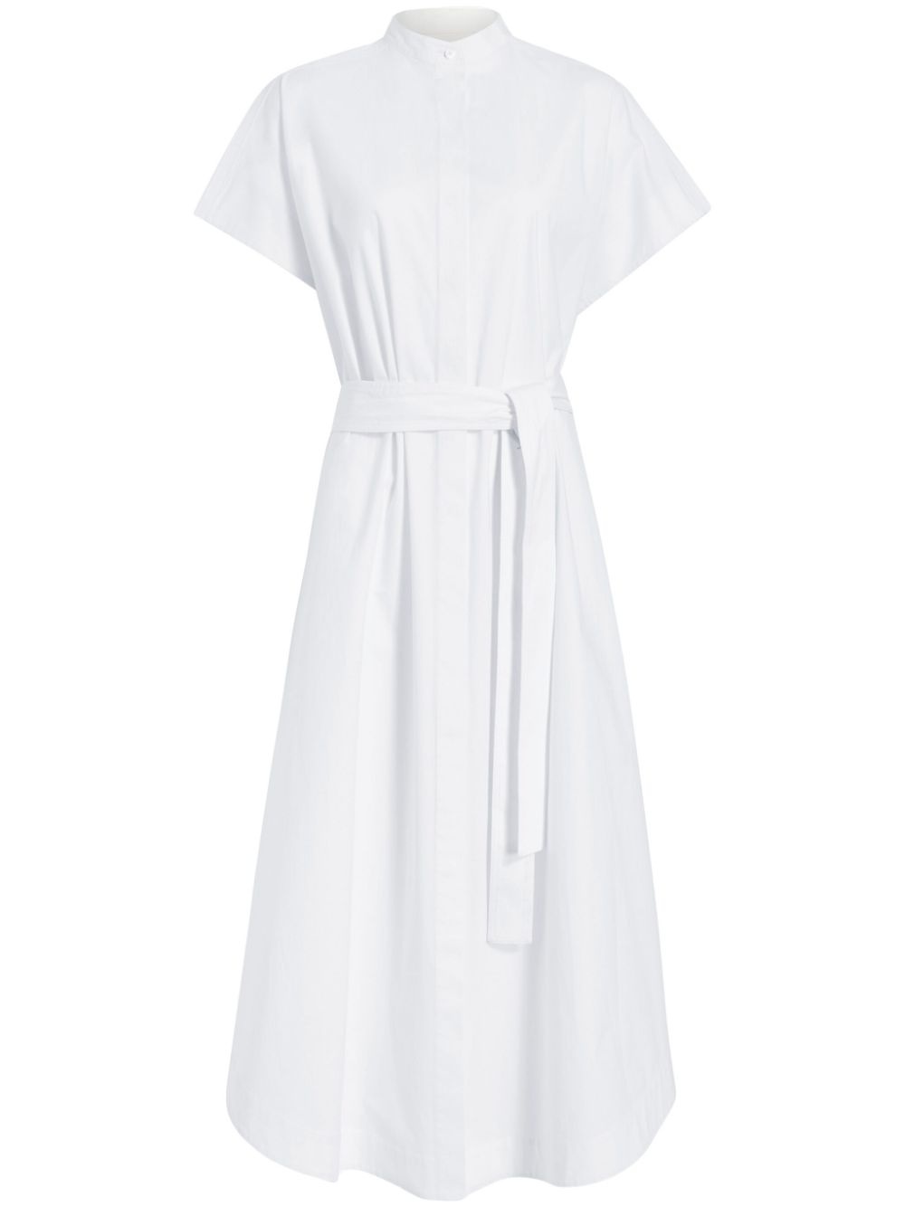 Walker midi dress Highlights - White - Front button fastening - Belted waist - Mock neck - Short sleeves Imported Composition Cotton 96%, Elastane 4% SIZE & FIT FittingInformation Designed to be unstructured, offering a loose fit throughout The adjustable tie waist gives a more adaptable and personalised fit Made from a midweight stretch fabric, this piece offers elasticity and flexibility when worn