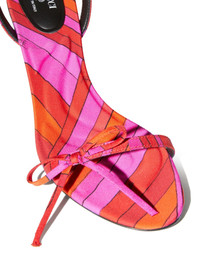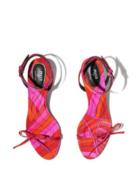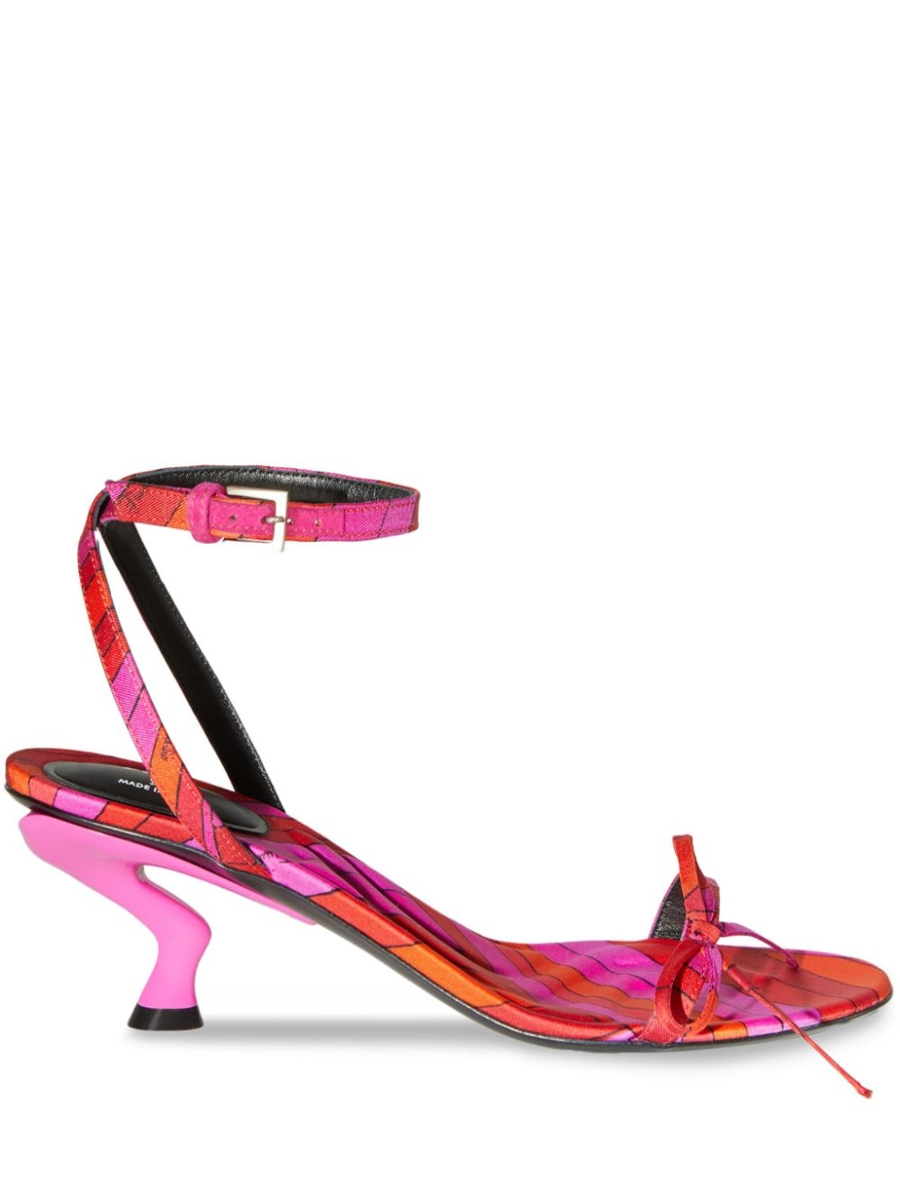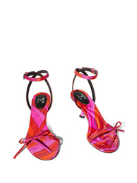 55mm Iris-print sandals Highlights - Scarlet red - Buckle-fastening ankle strap - Almond open toe - Bow detailing - Low sculpted heel Made in Italy Composition Silk 100% SIZE & FIT Measurement HEEL 2.16 in(5.5 cm)