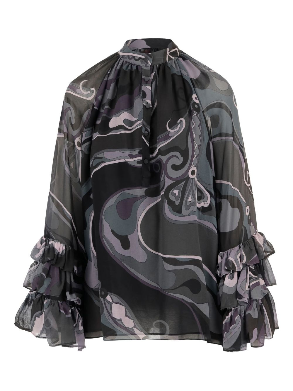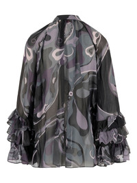 abstract-print ruffled blouse Highlights - Black - Abstract print - Ruffled sleeves - Button fastening - Flounce sleeves - High neck Made in Italy Composition Viscose 100% Washing instructions Read Manufacturer Guidelines