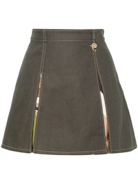 box-pleated twill miniskirt Highlights - Khaki - Stretch-cotton - Interlock twill weave - Contrast stitching - Signature gourmette-chain shoulder strap - Logo charm - Belt loops - Box-pleat design - Concealed side zip fastening - Straight hem - Thigh-length Made in Italy Composition Outer: Silk 100%, Cotton 97%, Spandex/Elastane 3% Lining: Acetate 67%, Polyester 33% SIZE & FIT Model measurements Height 5 ft 10 in(1.78 m) Bust/Chest 33.07 in(84 cm) Hips 36.61 in(93 cm) Waist 24.8 in(63 cm) FittingInformation This mini-length skirt is intended to be worn high on the waist Made from a midweight fabric This piece fits true to size – take your usual size