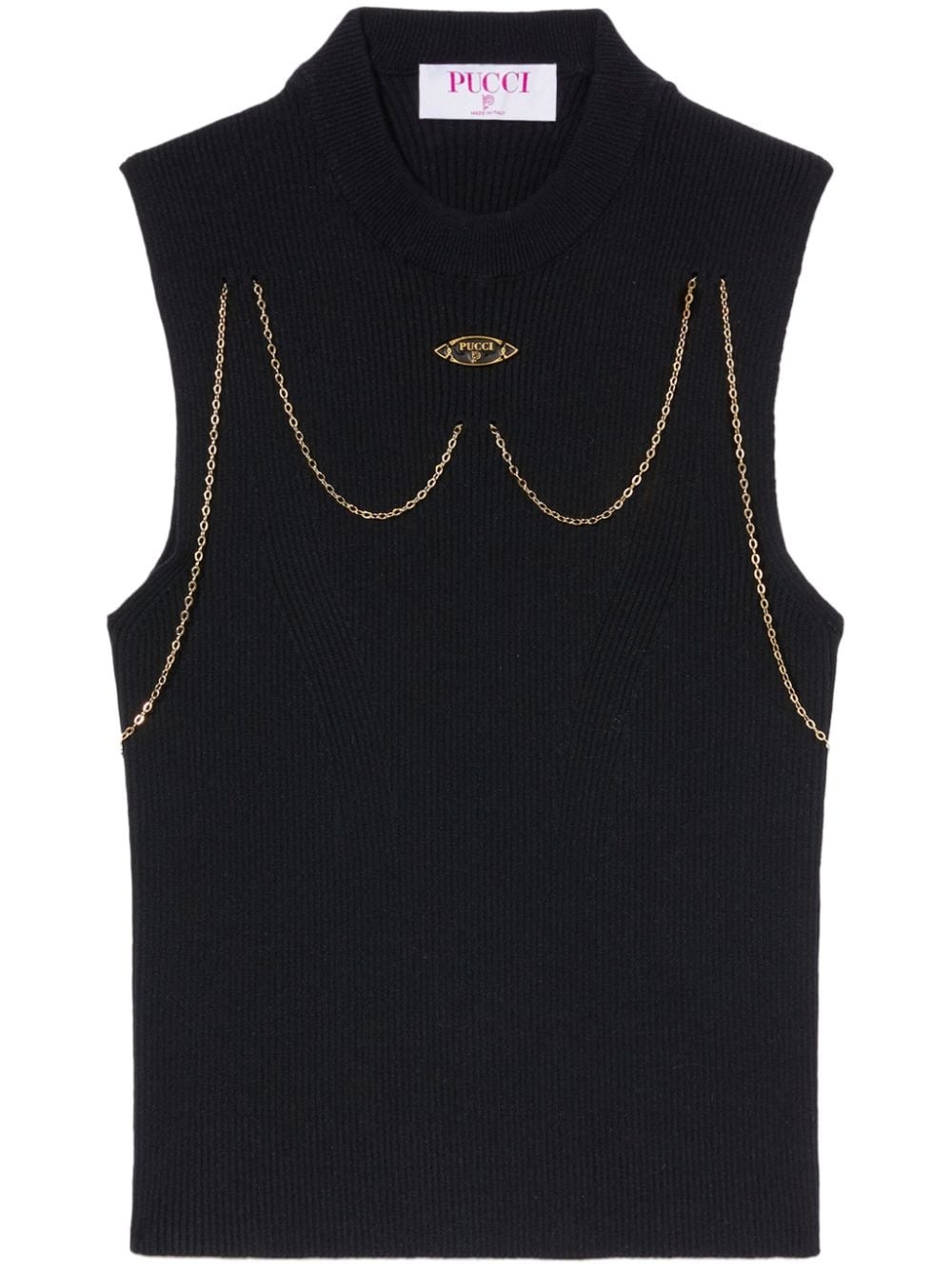 chain-embellished rib-knit top Highlights - Black - Ribbed knit - Chain-link detailing - Logo plaque - Round neck - Sleeveless - Straight hem Made in Italy Composition Viscose 70%, Polyester 30%