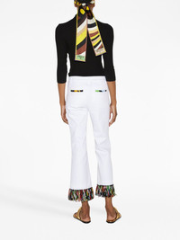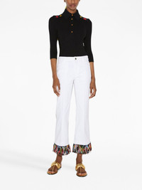 fringe-detailing cropped trousers Highlights - White - Stretch-cotton - Fringe detailing - Pressed crease - Belt loops - Button fly fastening - Flared - Cropped - Two rear welt pockets Made in Italy Composition Silk 100%, Polyester 100%, Cotton 99%, Spandex/Elastane 1% SIZE & FIT Measurement INSIDE LEG 28.74 in(73 cm) HIPS 38.58 in(98 cm) WAIST 31.49 in(80 cm)