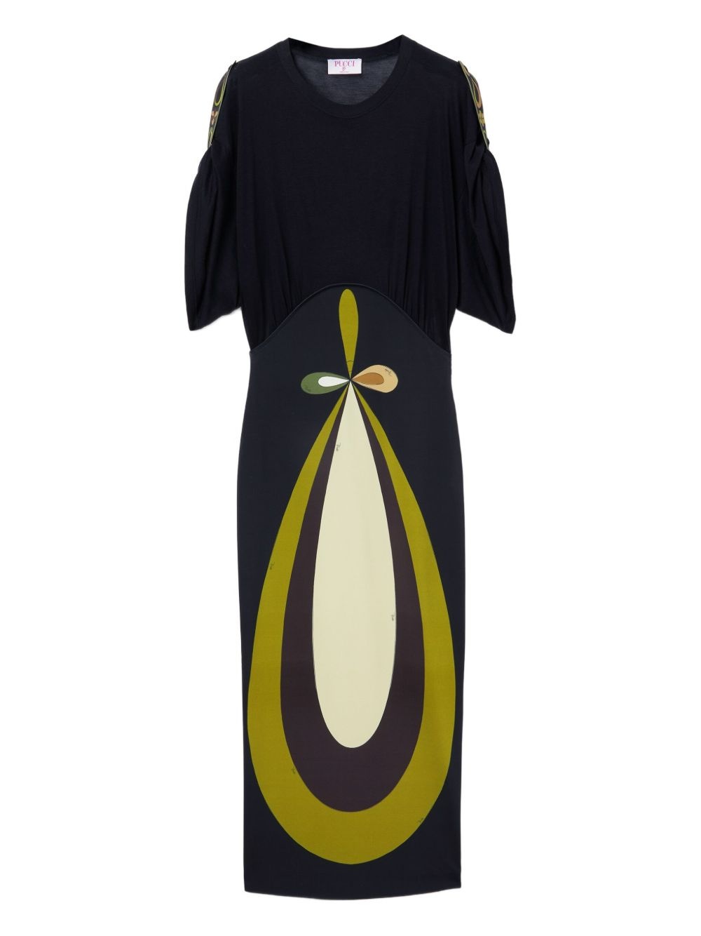 graphic-print maxi dress Highlights - Black - Bold graphic print - Round neck - Short puff sleeves - Contrasting playful design - Fitted silhouette Made in Italy Composition Silk 100%, Cotton 100%