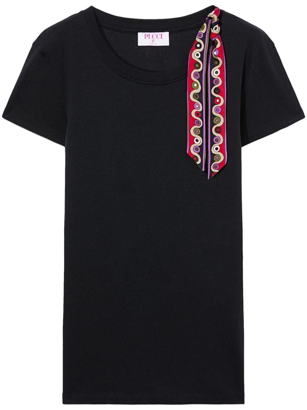 Iride-print ribbon T-shirt Highlights - Black - Cotton blend - Jersey texture - Iride-print ribbon detailing - Round neck - Short sleeves Imported Composition Cotton 50%, Modal 50%