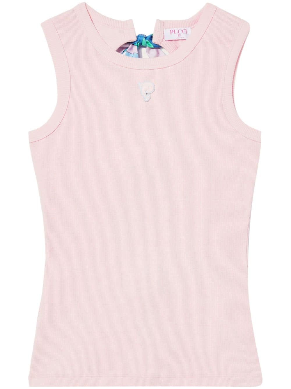 Iride-ribbon tank top Minimalist at first glance, this light-pink PUCCI top boasts a ribbed stretch-cotton base adorned with cut-outs and an Iride-print ribbon fastening to the rear. It's punctuated with an intertwined-fish logo applique at the chest. Highlights - Light pink - Stretch-cotton - Fine ribbed - Abstract pattern print - Applique logo - Cut-out detailing - Crew neck - Rear ribbon fastening - Sleeveless - Straight hem Made in Italy Composition Cotton 98%, Spandex/Elastane 2%
