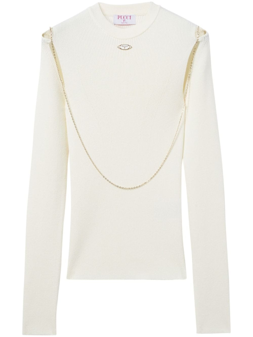 logo-plaque chain-link ribbed top Highlights - White - Ribbed knit - Gold-tone logo plaque - Chain-link detailing - Crew neck - Long sleeves - Straight hem Made in Italy Composition Viscose 70%, Polyester 30%