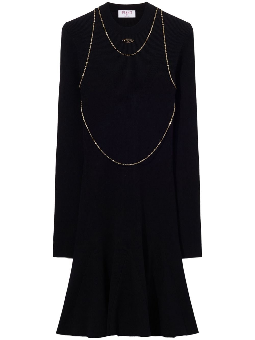 logo-plaque mini dress Highlights - Black - Knitted construction - Gold-tone logo plaque - Chain-link embroidery - Round neck - Long sleeves - Flared hem - Thigh-length Made in Italy Composition Viscose 70%, Polyester 30%