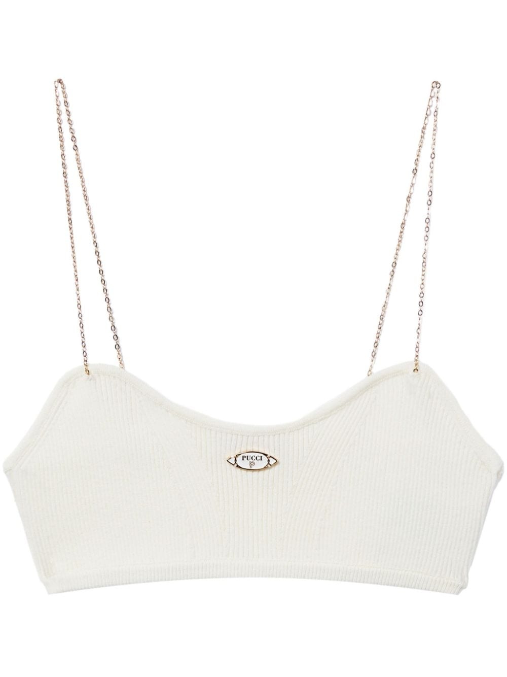 logo-plaque ribbed crop top Highlights - White - Ribbed knit - Gold-tone logo plaque - Two chain-link shoulder straps - Scoop neck - Cropped Made in Italy Composition Viscose 70%, Polyester 30%
