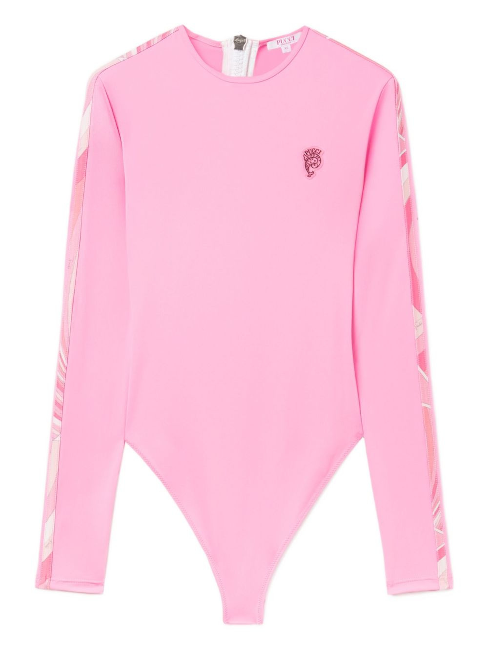 long-sleeve panelled swimsuit Highlights - Pink - Long sleeves - Zip fastening - Abstract print panelling - Round neck - Be mindful to try on swimwear over your own garments. Made in Italy Composition Polyamide 82%, Elastane 18%