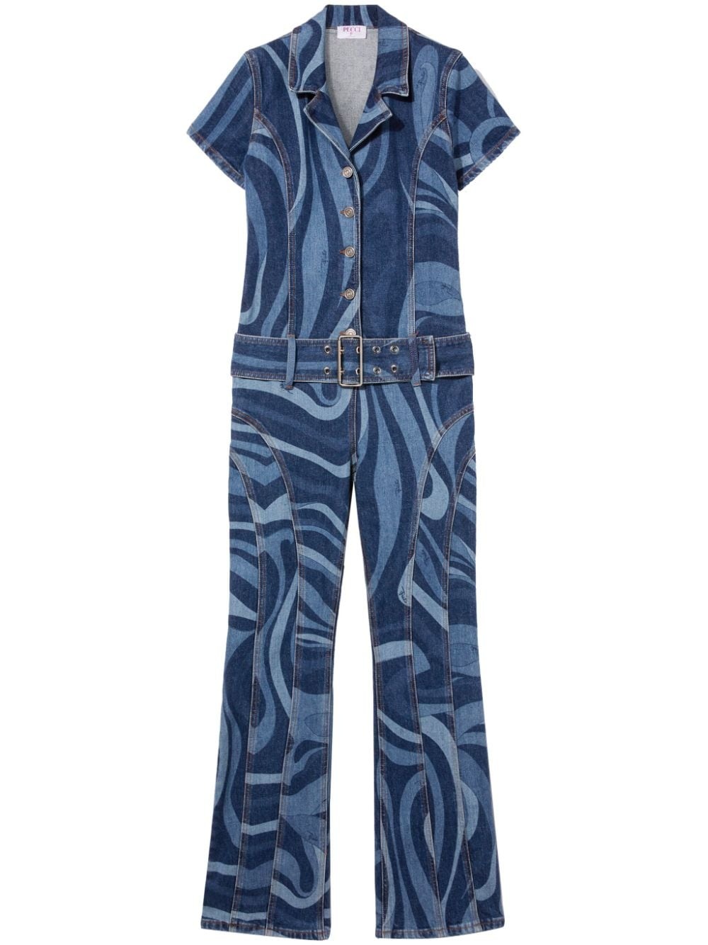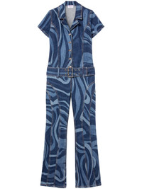 Marmo-print denim jumpsuit The swirling lines of Pucci's ocean-inspired Marmo print decorate this denim jumpsuit. Made in Italy, it's designed for a close fit and includes short sleeves, a belted waist and silver-tone hardware. Highlights - Blue - Stretch-cotton - Denim - Abstract pattern print - Pointed flat collar - Front button fastening - Short sleeves - Belted waist - Two rear patch pockets - Applique logo - Straight leg Made in Italy Composition Cotton 99%, Elastane 1%