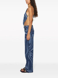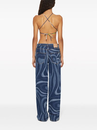 Marmo-print denim top Crafted from stretch cotton denim, this indigo-blue PUCCI top is saturated with the brand's signature Marmo print, its undulating lines complementing the water drop-like silhouette. It is held by thin Iride-print straps which cross over the open back. Highlights - Indigo blue - Stretch-cotton - Denim - Abstract pattern print - Triangle neck - Rear tie fastening - Rear criss-cross straps - Asymmetric hem Made in Italy Composition Cotton 99%, Elastane 1% SIZE & FIT Measurement CHEST 39.37 in(100 cm) LENGTH 17.32 in(44 cm) WAIST 31.1 in(79 cm)