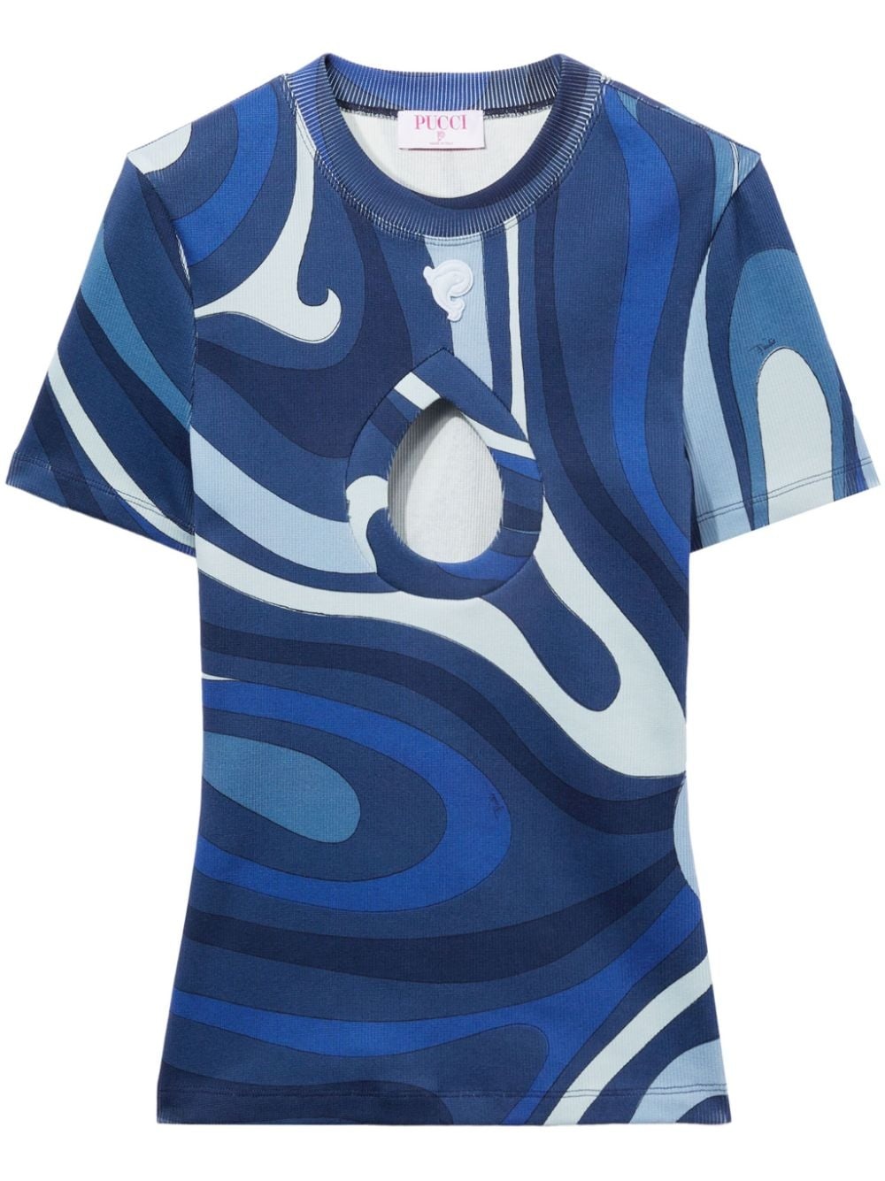 Marmo-print T-shirt The undulating lines and blue tonality of this PUCCI T-shirt evoke an oceanic quality. Made from stretch-cotton to a short-sleeve silhouette, it's saturated with the brand's signature Marmo print. A logo applique and teardrop cut-out at the front complete it. Highlights - Navy blue/multicolour - Stretch-cotton - Abstract pattern print - Cut-out detailing - Applique logo - Crew neck - Short sleeves - Straight hem Made in Italy Composition Cotton 98%, Elastane 2%
